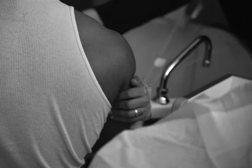 Person receiving an injection in their upper arm at a hospital or clinic.
