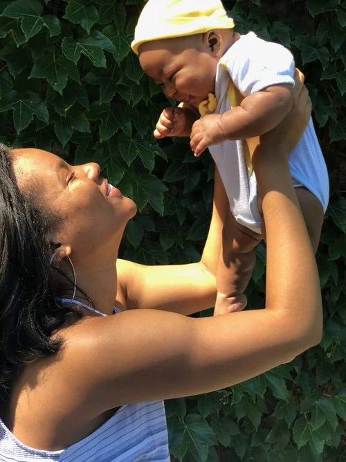A woman holding a baby up in the air outdoors in front of green leaves, both smiling.